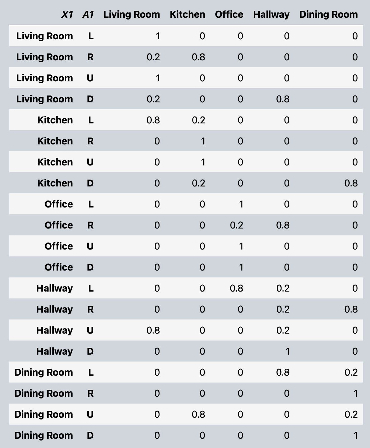 Below is the probability table we want to model. Given, current room X1, action A1, what’s the probability of being in each room in X2.